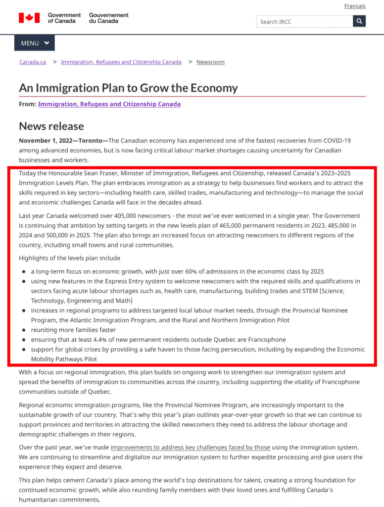 加拿大本身新移民主要通過快速通道 (EE)加拿大經驗類移民項目,以及和省提名項目移民。目前,加拿大正面臨嚴重的勞動力短缺問題,有近一百萬個職位空缺。與此同時,加拿大的低出生率將使移民很快成為加拿大人口和勞動力增長的唯一途徑。該計劃旨在通過移民作為幫助企業找到員工,關鍵行業包括醫療護理、技工行業、製造業和技術等,以應對加拿大在未來幾十年將面臨的社會和經濟挑戰。