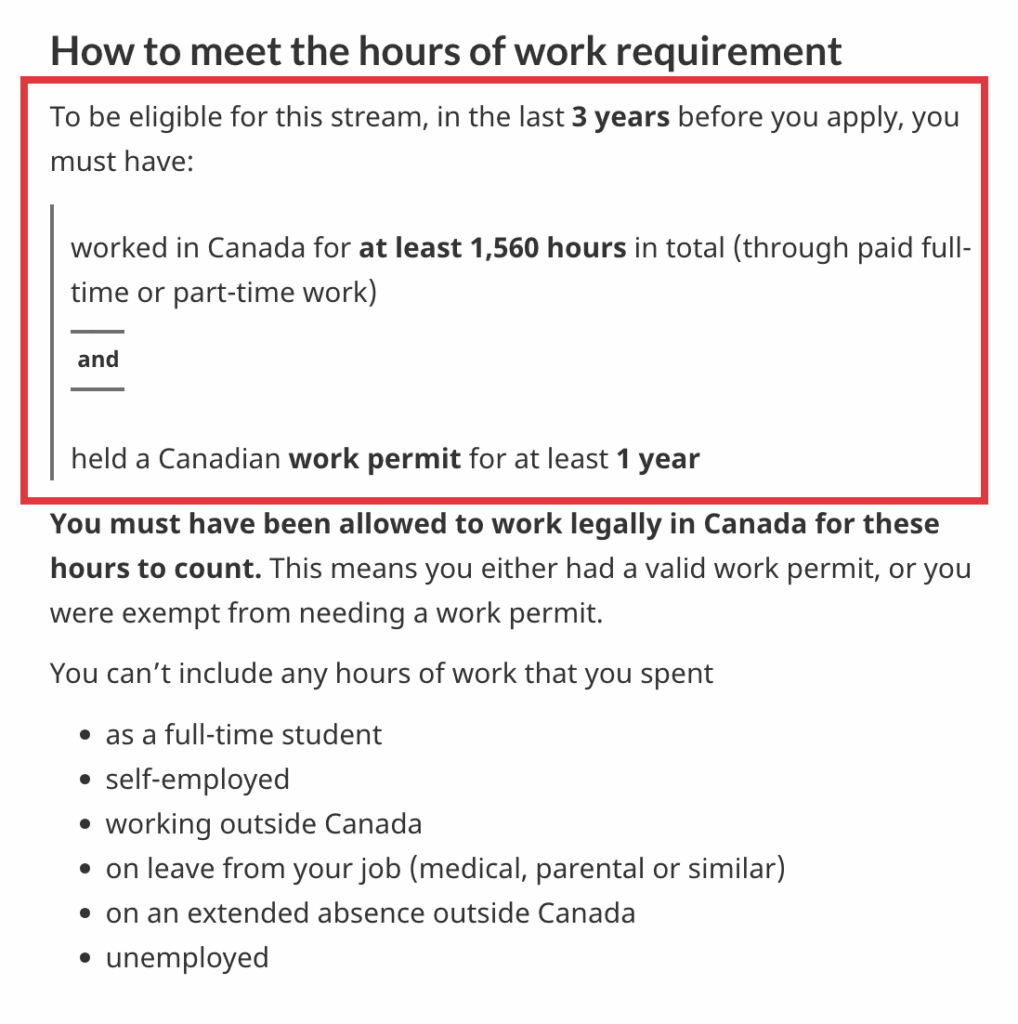 根據最新規定,香港居民只要於遞交永久居民申請前三年內,累積至少 1,560 小時 的有薪全職或兼職加拿大工作經驗,並曾持有 加拿大有效工作簽證最少一年,便符合資格透過 Stream B 申請加拿大永久居民(Permanent Residence)。