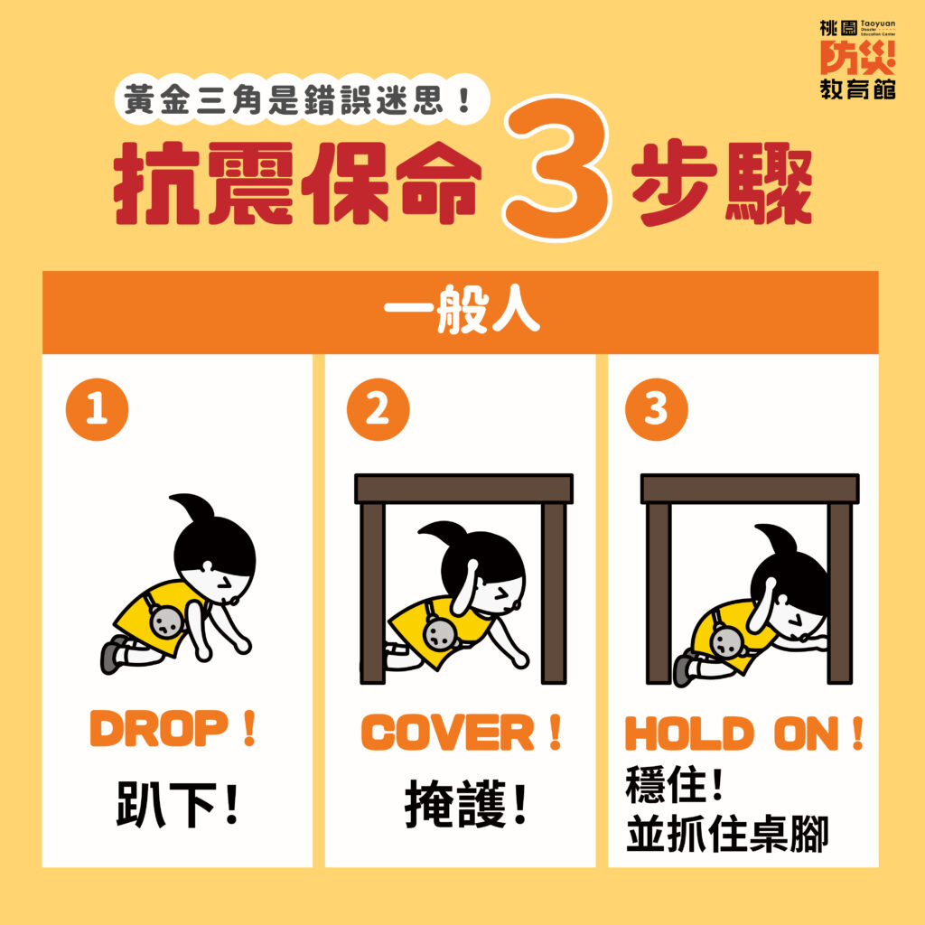1. 趴下、掩護、穩住(Drop, Cover, Hold On)