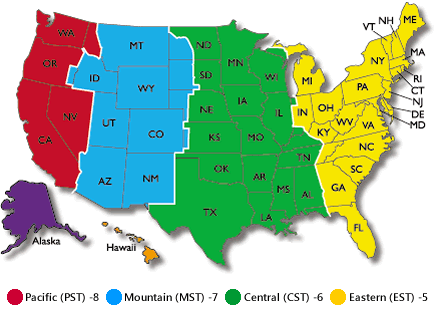| 太平洋時區 Pacific Time | PST | GMT−8 | 加州、華盛頓州、內華達州等 |