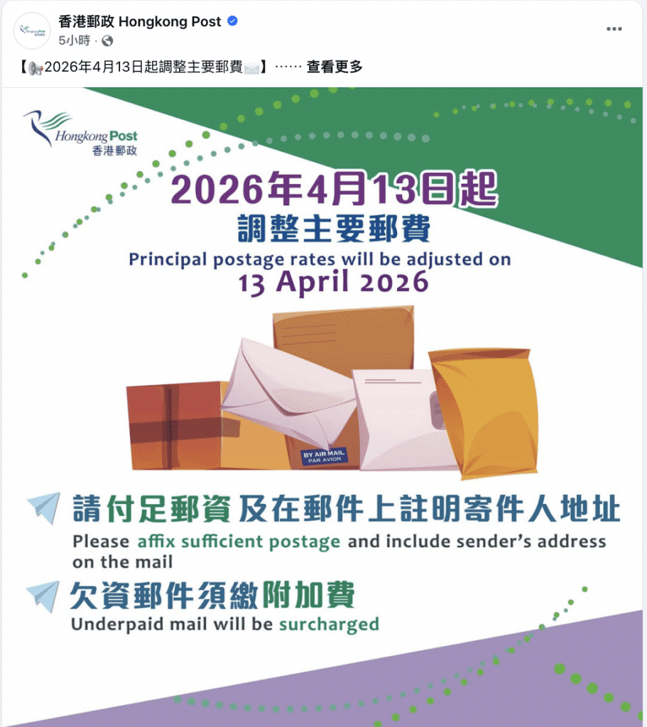 香港郵政宣布,將於2026年4月13日起正式調整主要郵費。是次香港郵費調整,主要反映由2022年9月至2026年1月期間的累計通脹影響,同時亦回應郵政服務市場轉變及營運成本上升的壓力。