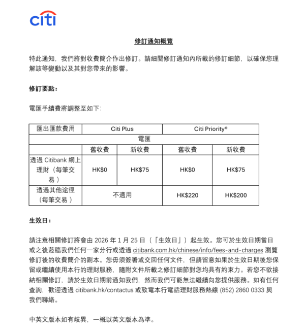 根據花旗銀行最新公告,由2026年1月25日 起,電匯匯出收費將作出以下調整: