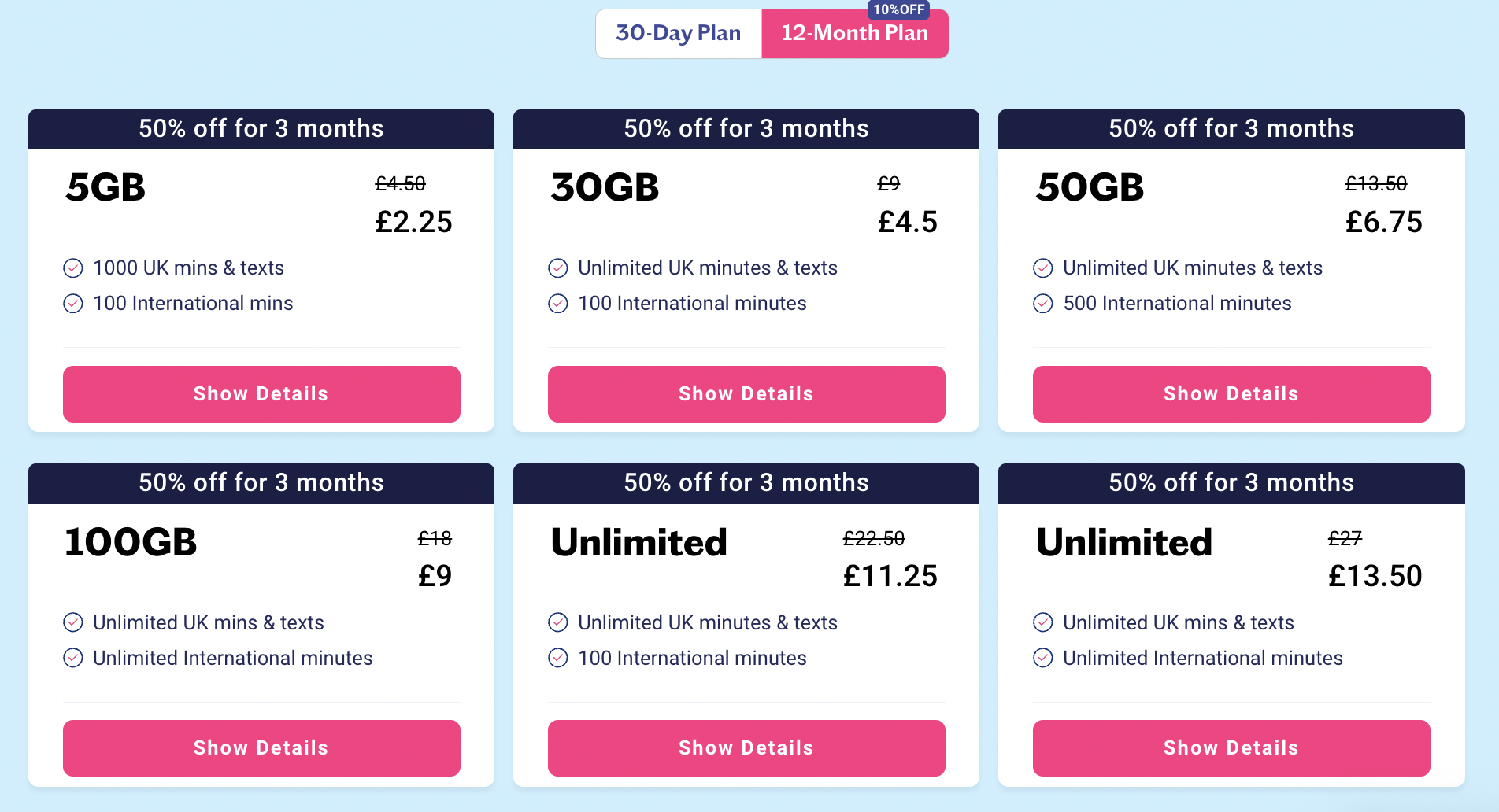 Lebara主要分兩款優惠:30日和12個月的月費5G Plan,首3個月有半價優惠。