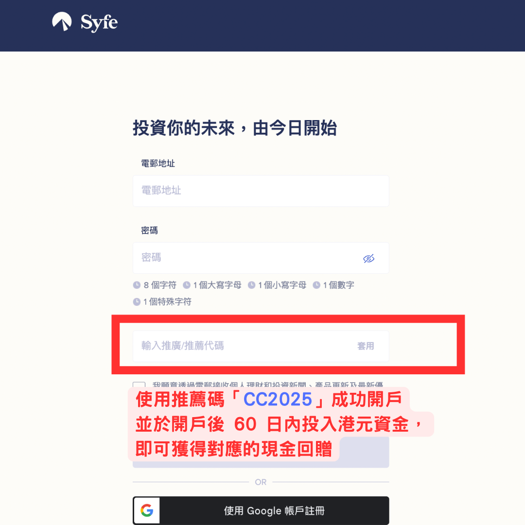 Syfe 為新用戶提供專屬開戶獎賞。使用推薦碼「CC2025」成功開戶,並於開戶後 60 日內投入港元資金,即可獲得對應的現金回贈: